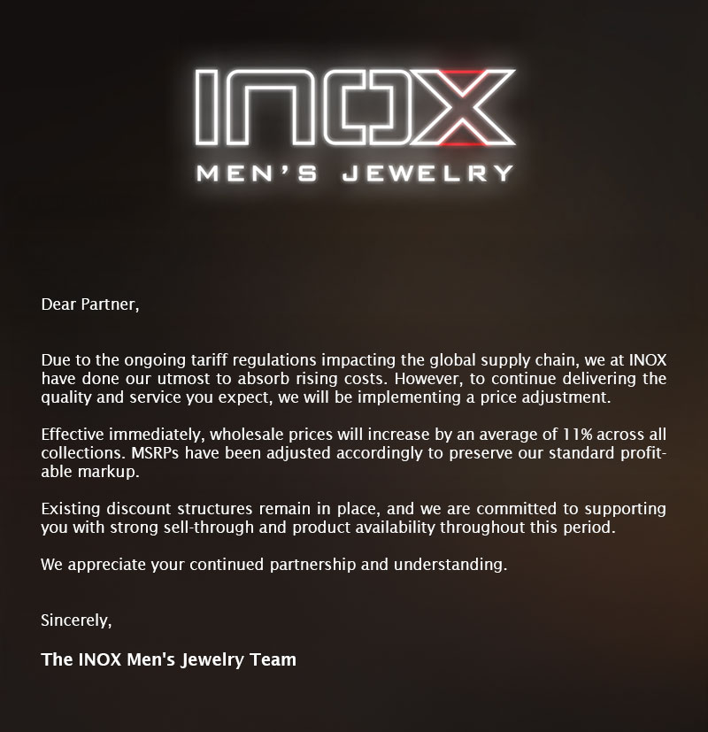 Inox News Newsletter Official Notice – INOX Pricing Adjustment April 23, 2025April 23, 2025INOX Men's JewelryComment(0)